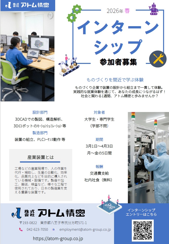 株式会社アトム精密では、2026年も学生の皆さま向けにインターンシップを開催いたします。